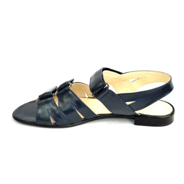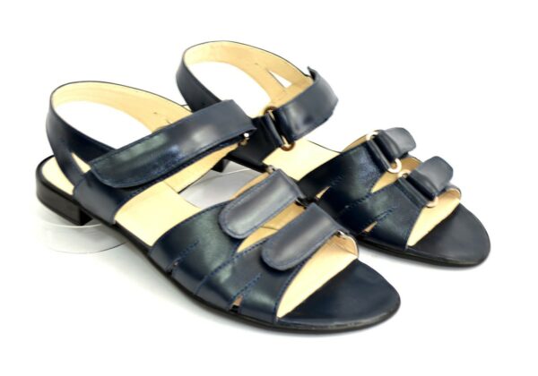 Легкие летние босоножки на маленьком колечке, из натуральной кожи синего цвета, с регулирующей подъем застежкой. Благодаря дополнительной фиксации голеностопа их удобно носить и преодолевать в них длительные дистанции. Полномерные соответствуют стандартной сетке размера. Возможен отшив в коже, замши разных