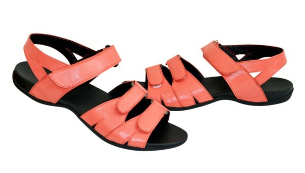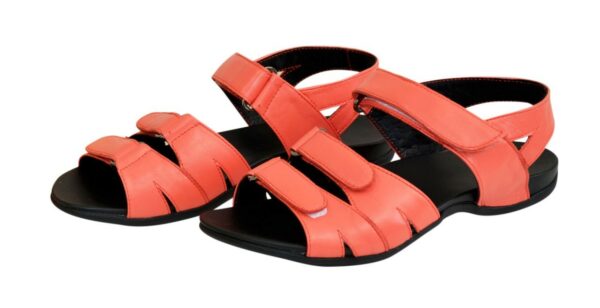Легкие летние босоножки на литой ортопедической подошве, из натуральной кожи кораллового цвета, с регулирующей подъем застежкой. Благодаря дополнительной фиксации голеностопа их удобно носить и преодолевать в них длительные дистанции. Полномерные соответствуют стандартной сетке размера. Возможен отшив в коже, замши разных цветов.