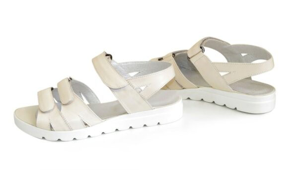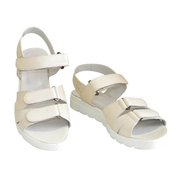 Легкие летние босоножки на сплошной тракторной подошве, из натуральной кожи бежевого цвета, с регулирующей подъем застежкой. Благодаря дополнительной фиксации голеностопа их удобно носить и преодолевать в них длительные дистанции. Полномерные соответствуют стандартной сетке размера. Возможен отшив в коже, замши разных