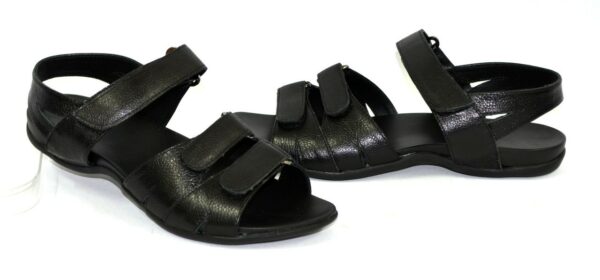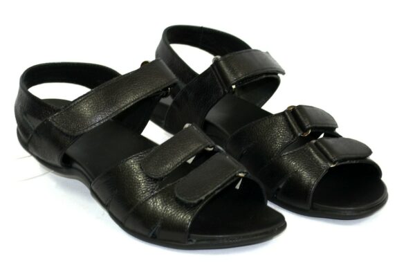 Легкие летние босоножки на литой ортопедической подошве, из натуральной кожи черного цвета, с регулирующей подъем застежкой. Благодаря дополнительной фиксации голеностопа их удобно носить и преодолевать в них длительные дистанции. Полномерные соответствуют стандартной сетке размера. Возможен отшив в коже, замши разных цветов.