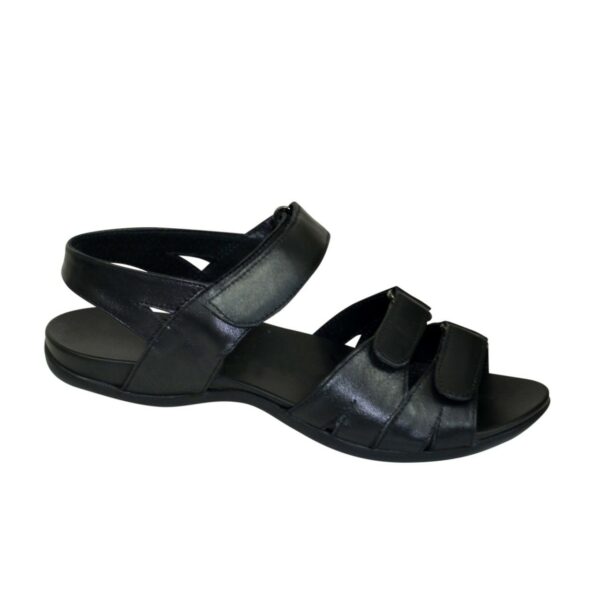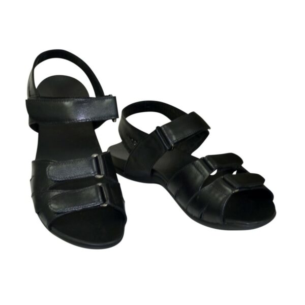 Легкие летние босоножки на литой ортопедической подошве, из натуральной кожи черного цвета, с регулирующей подъем застежкой. Благодаря дополнительной фиксации голеностопа их удобно носить и преодолевать в них длительные дистанции. Полномерные соответствуют стандартной сетке размера. Возможен отшив в коже, замши разных цветов.