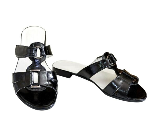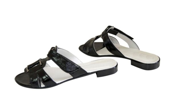 Удобные шлепки на легкой полиуретановой подошве с каблуком 1.5см, из натуральной лаковой кожи черного цвета, полномерные соответствуют стандартной сетке. Подъем регулируется липучкой, подойдет на полную ногу. Возможен отшив в коже, замши разных цветов.