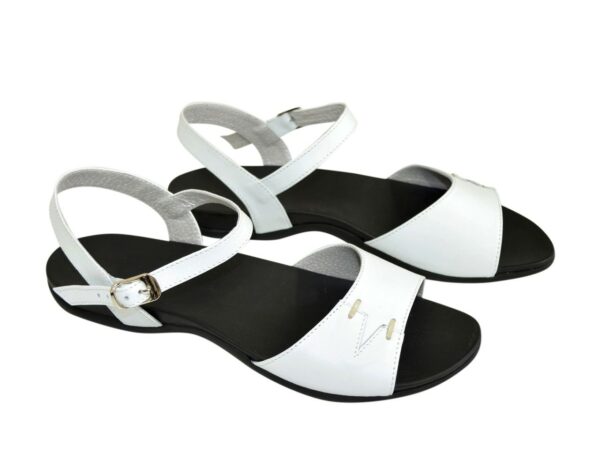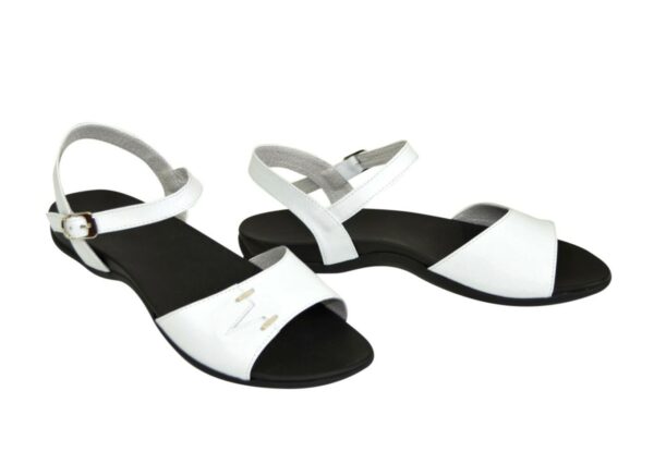 Легкие босоножки на литой ортопедической подошве из натуральной кожи белого цвета. Благодаря дополнительной фиксации голеностопа их удобно носить и преодолевать в них длительные дистанции. Полномерные соответствуют стандартной сетке размера. Возможен отшив в коже, замши разных цветов.