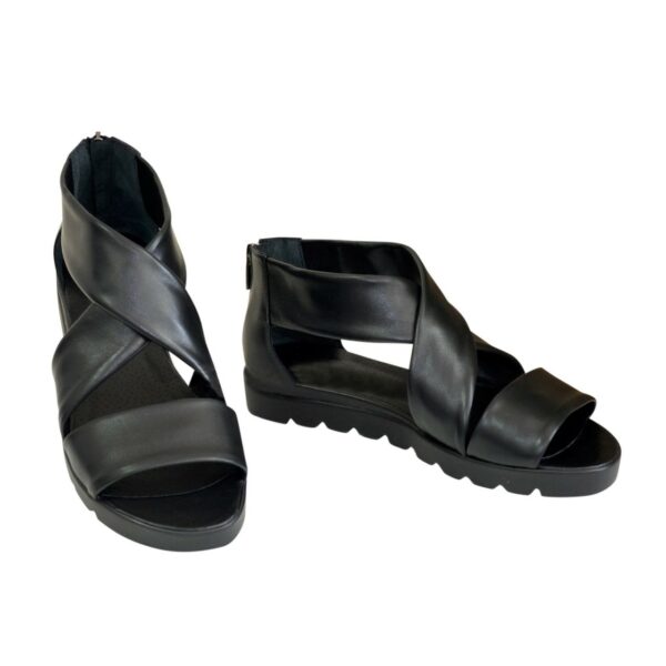 Стильные женские босоножки римлянки из черной натуральной кожи, на утолщенной подошве, с молнией. Благодаря дополнительной фиксации голеностопа их удобно носить и преодолевать в них длительные дистанции. Полномерные соответствуют стандартной сетке размера. Возможен отшив в коже, замши разных цветов.