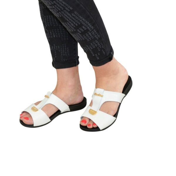 Летние шлепки на легкой полиуретановой подошве, из натуральной кожи белого цвета, с декорацией из фурнитуры, полномерные соответствуют стандартной сетке. Возможен отшив в коже, замши разных цветов.