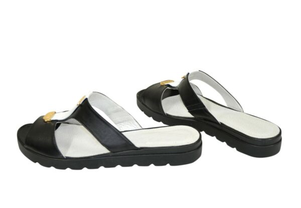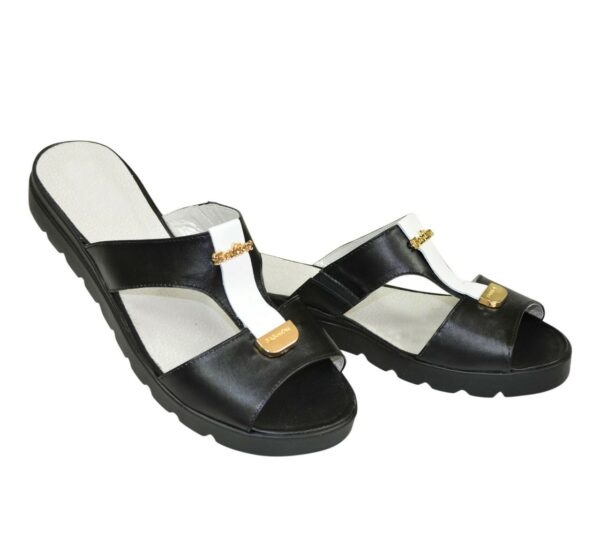 Летние шлепанцы на легкой полиуретановой подошве с тракторным протектором, из натуральной кожи черного и белого цвета, с декорацией из фурнитуры, полномерные соответствуют стандартной сетке. Возможен отшив в коже, замши разных цветов.