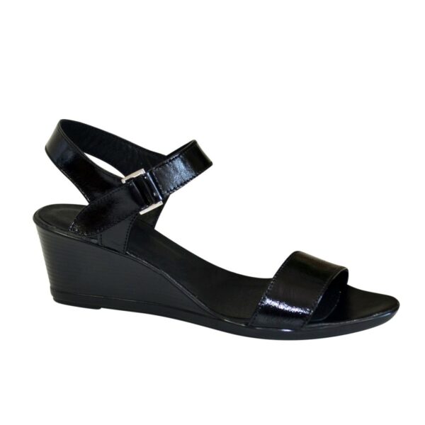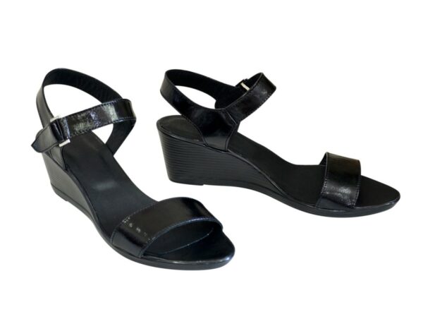Очень удобны женские босоножки из натуральной лаковой кожи черного цвета, на танкетке 4.5 см. Полномерные соответствуют стандартной размерной сетке. Эта модель обуви максимально комфортно сидит на ноге. Благодаря дополнительной фиксации голеностопа их удобно носить и преодолевать в них длительные дистанции. Возможен отшив в коже, замши разных цветов.