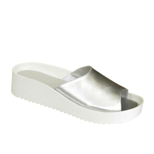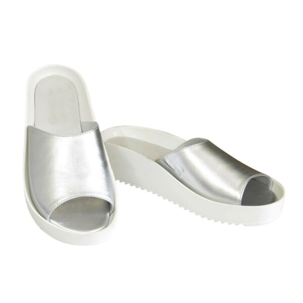 Удобные шлепки на легкой полиуретановой подошве, из натуральной кожи серебряного цвета, с резинкой соответствуют стандартной сетке. На узкую и среднюю ногу (благодаря резинке) Возможен отшив в коже, замши разных цветов.