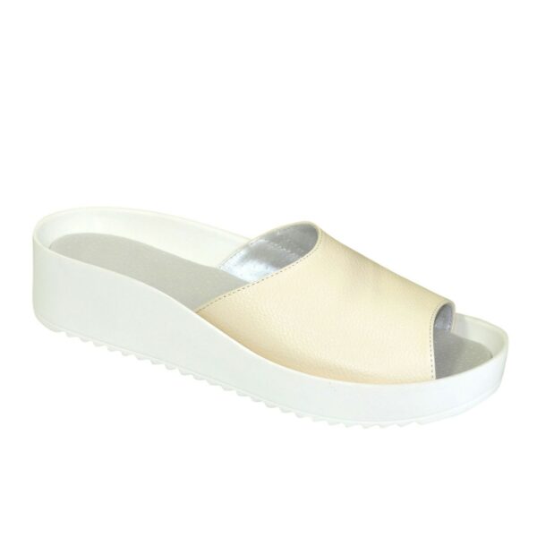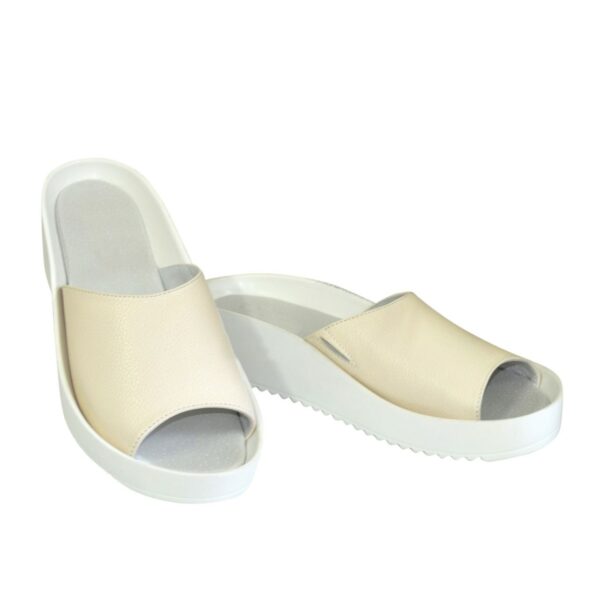 Удобные шлепки на легкой полиуретановой подошве, из натуральной кожи бежевого цвета, с резинкой, мягкая стелька обтянута светлой кожей, соответствуют стандартной размерной сетке. На узкую и среднюю ногу. Возможен отшив в коже, замши разных цветов.