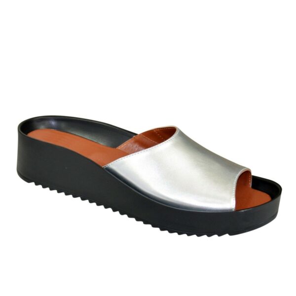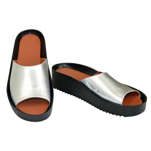 Удобные шлепки на легкой полиуретановой подошве, из натуральной кожи цвет серебро, с резинкой соответствуют стандартной размерной сетке. На узкую и среднюю ногу. Возможен отшив в коже, замши разных цветов.