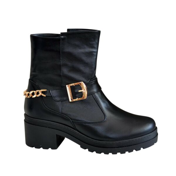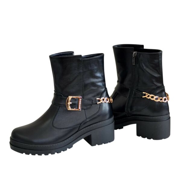 Модные стильные женские ботинки на утолщенной подошве изготовлены из натуральной кожи черного цвета. Декорированные цепью и ремешком. Очень удобные, идеально сидящие на ножке – подчеркнут вашу индивидуальность.