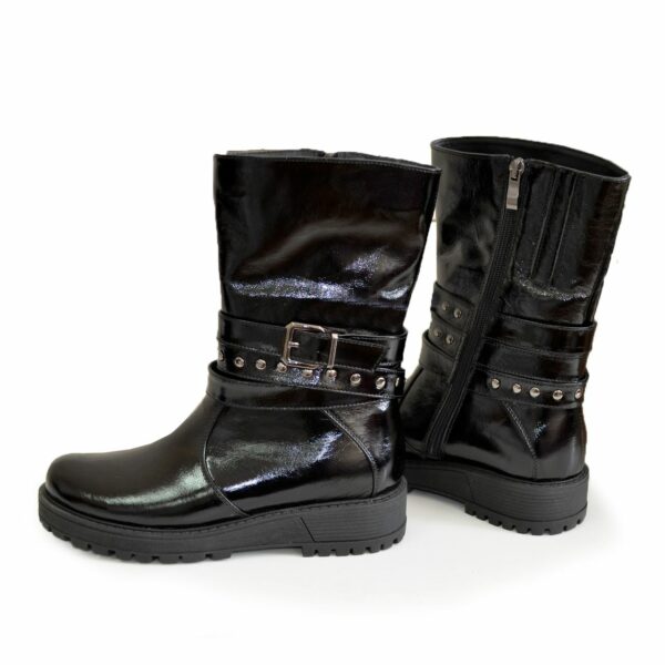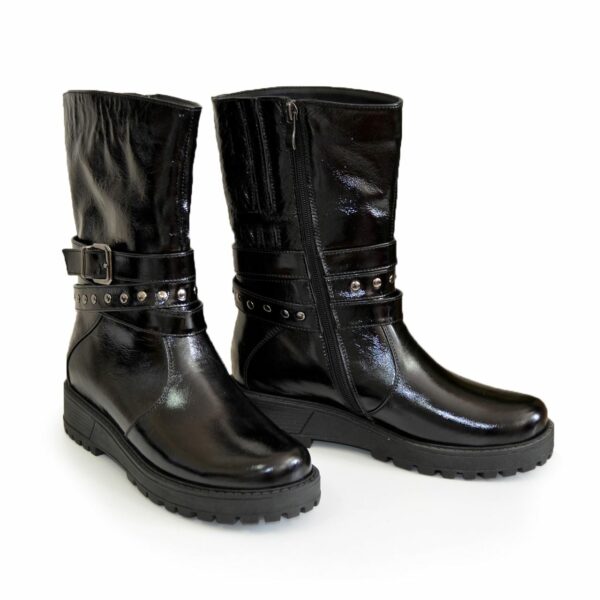 Стильные женские полусапоги на утолщенной подошве изготовлены из натуральной лаковой кожи черного цвета, декорированы ремешками из натуральной лаковой черной кожи. Незаменимы каждый день, очень удобны, идеально сидят на ножке – подчеркнут вашу индивидуальность.