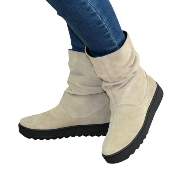 Стильные женские женские ботинки прямой одежды на сплошной утолщенной подошве, изготовленные из натуральной замши бежевого цвета. Комфортные и аккуратные, идеально сидящие на ножке.