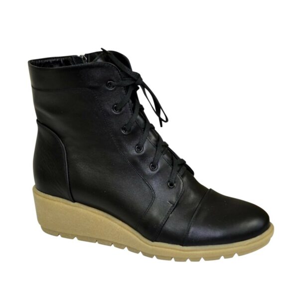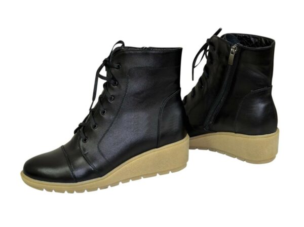 Классические женские ботинки на танкетке изготовлены из натуральной кожи черного цвета. С молнией и шнуровкой, благодаря которой регулируется подъем. Очень удобные, идеально сидящие на ножке.