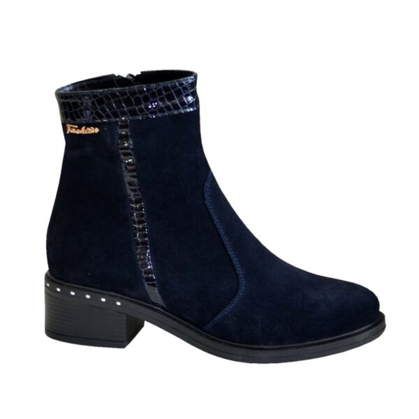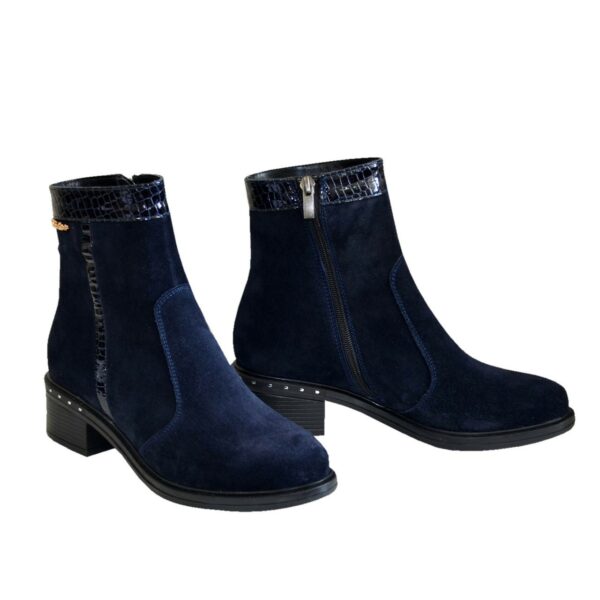 Классические женские ботинки на невысоком каблуке, изготовленные из натуральной замши синего цвета с отделкой из натуральной лаковой кожи с тиснением "рептилии" и золотой фурнитурой.