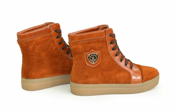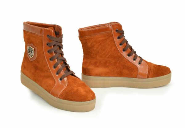 Модные стильные женские ботинки на утолщенной подошве изготовлены из замши рыжего цвета. Декорированы вставкой из натуральной кожи рыжего цвета и фурнитурой. Очень удобные, идеально сидящие на ножке – подчеркнут вашу индивидуальность.