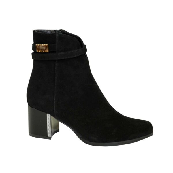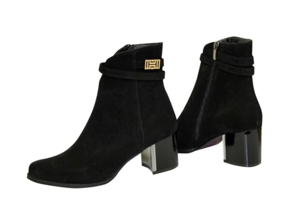 Классические женские ботинки на удобном невысоком каблуке, изготовленные из натуральной замши черного цвета. Украшены фурнитурой. Очень удобные, идеально сидящие на ножке.