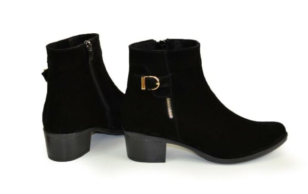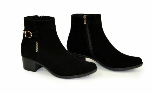 Классические женские ботинки на невысоком стойком каблуке, изготовленные из натуральной замши черного цвета. Декорированы молнией и ремешком.