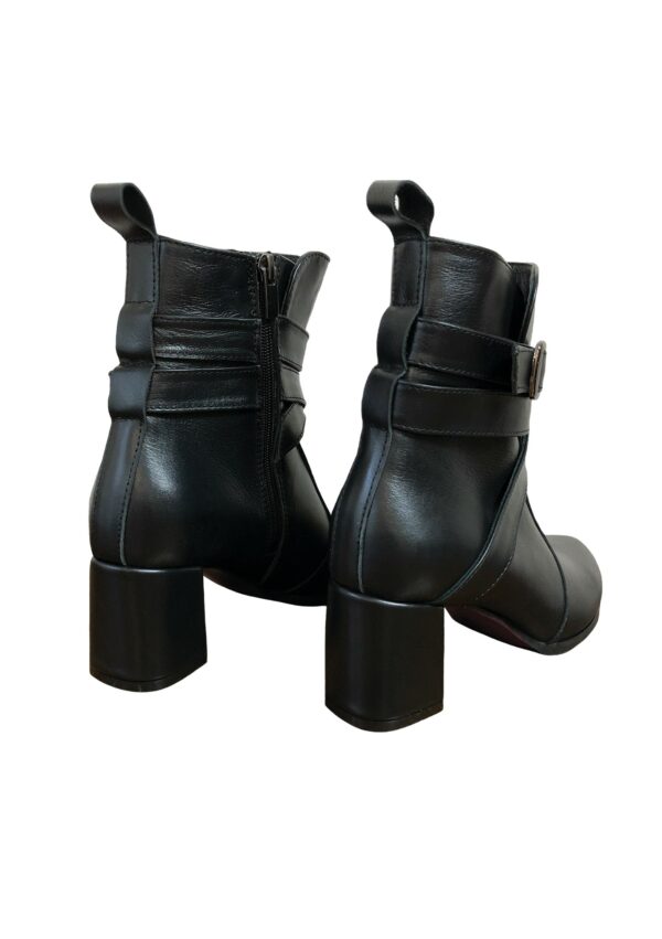 Стильные женские ботинки на обтянутом коже каблуке, изготовленные из натуральной кожи черного цвета. С молнией украшены ремешками и пряжкой. Очень удобные, идеально сидящие на ножке.