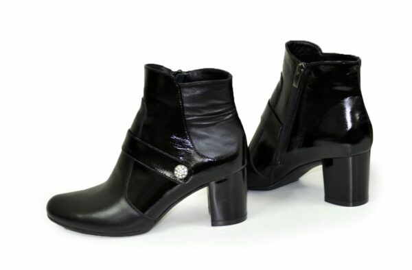 Ботинки женские классические на широком стойком подборе, изготовлены из натуральной кожи и вставками лаковой кожи черного цвета, декорированы ремешком и фурнитурой. Незаменимы на каждый день, очень удобны, практичны, идеально сидят на ножке – подчеркнут Вашу индивидуальность.