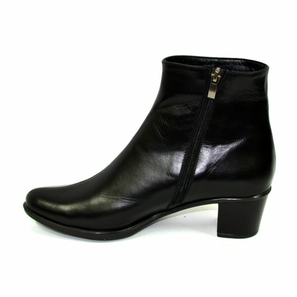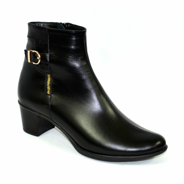 Классические женские ботинки на невысоком стойком каблуке, изготовленные из натуральной кожи черного цвета. Декорированы молнией и ремешком.