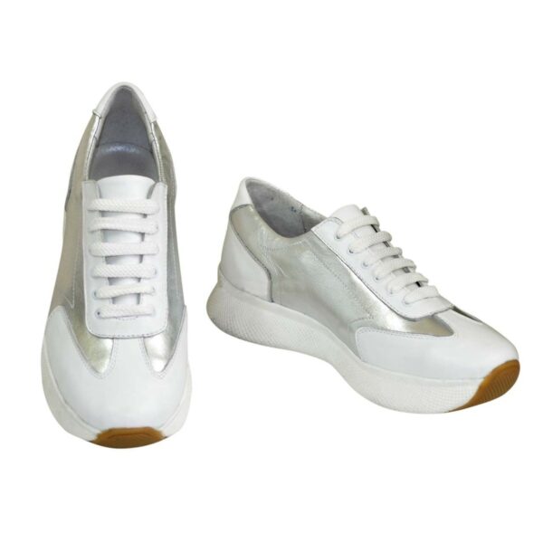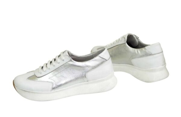 Классические, комфортные кроссовки, изготовленные из натуральной кожи белого и серебряного цвета. С мягким кантом и мягким языком. Прекрасно сидят на ножке. Полномерные, соответствуют стандартной сетке размера. Рассчитаны на разную полноту ноги благодаря шнуровке. Возможен отшив в коже, замши разных цветов.