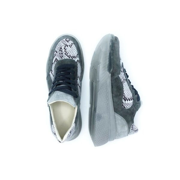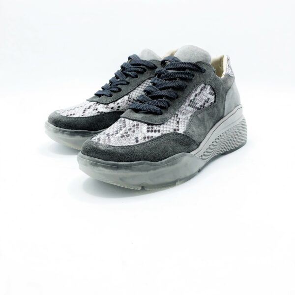 Стильные кроссовки изготовлены из натуральной кожи питона и натуральной замши серого цвета. Прекрасно сидят на ножке. Полномерные, соответствуют стандартной сетке размера. Рассчитаны на разную полноту ноги благодаря шнуровке. Возможен отшив в коже, замши разных цветов.
