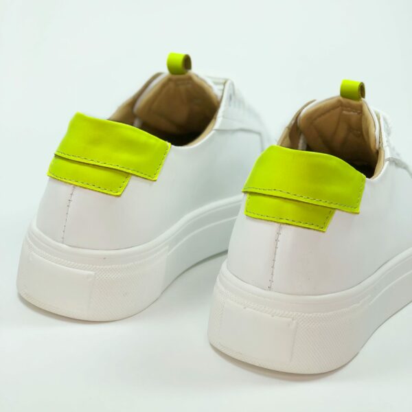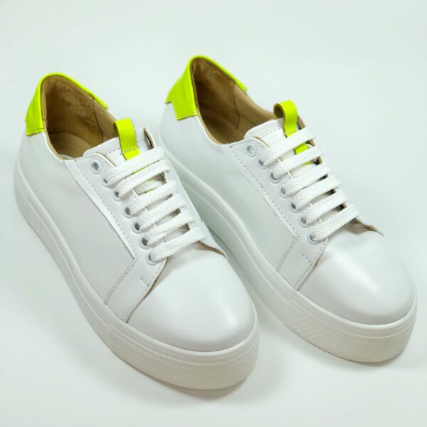Стильные молодежные кроссовки из натуральной кожи белого цвета, задник желтого цвета, на облегченной подошве. Изготавливаются только из натуральных материалов. Полномерные соответствуют стандартной сетке размера. Возможен отшив в коже и замши разных цветов – учитываем любые пожелания заказчика