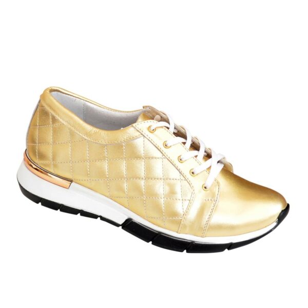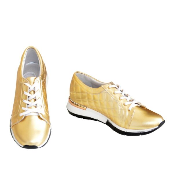 Стильные кроссовки сделаны из натуральной кожи золотого цвета. С мягким кантом и вы строчкой на берке. Прекрасно сидят на ножке. Полномерные, соответствуют стандартной сетке размера. Рассчитаны на разную полноту ноги благодаря шнуровке. Возможен отшив в коже, замши разных цветов.