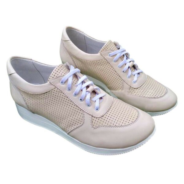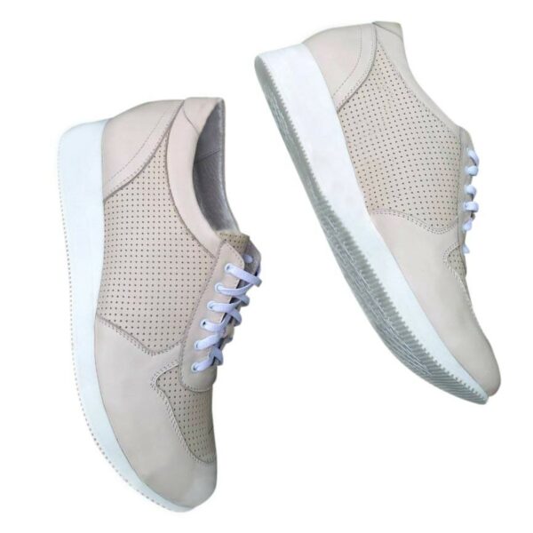 Стильные, комфортные кроссовки сделаны из натуральной кожи бежевого цвета. С мягким кантом и мягким языком. Прекрасно сидят на ножке. Полномерные, соответствуют стандартной сетке размера. Рассчитаны на разную полноту ноги благодаря шнуровке. Возможен отшив в коже, замши разных цветов.
