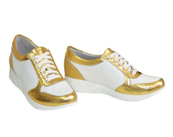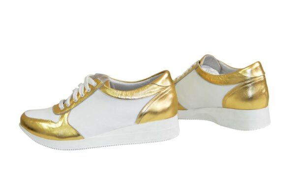 Стильные, комфортные кроссовки, изготовленные из натуральной кожи белого и золотого цвета. С мягким кантом и мягким языком. Прекрасно сидят на ножке. Полномерные, соответствуют стандартной сетке размера. Рассчитаны на разную полноту ноги благодаря шнуровке. Возможен отшив в коже, замши разных цветов.