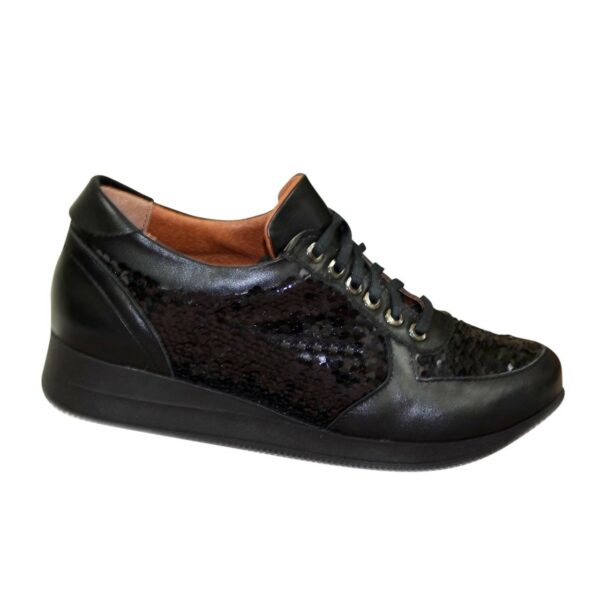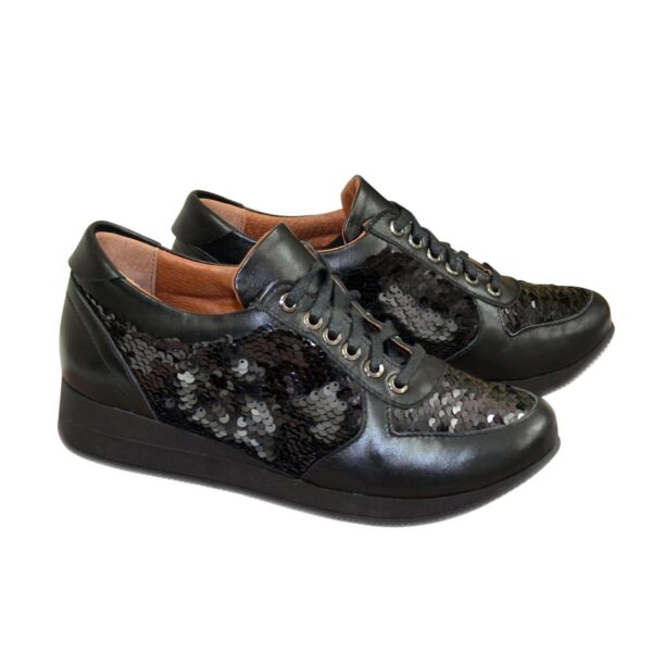 Мягкие, комфортные кроссовки изготовлены из натуральной кожи черного цвета, декорированы пайетками. С кантом и на мягком языке. Прекрасно сидят на ножке. Полномерные, соответствуют стандартной сетке размера. Рассчитаны на разную полноту ноги благодаря шнуровке. Возможен отшив в коже, замши разных цветов.
