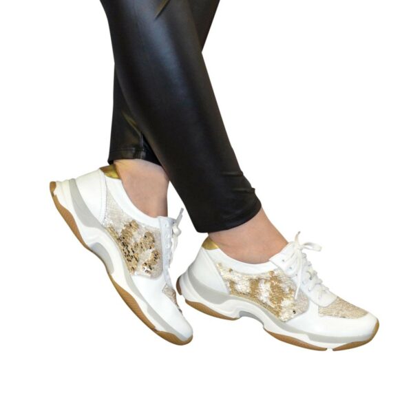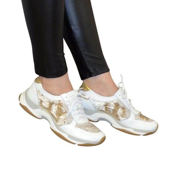 Яркие блестящие, комфортные кроссовки, изготовленные из натуральной кожи белого цвета с декорацией из золотых паеток. С мягким кантом и мягким языком. Прекрасно сидят на ножке. Полномерные, соответствуют стандартной сетке размера. Рассчитаны на разную полноту ноги благодаря шнуровке. Возможен отшив в коже, замши разных цветов.