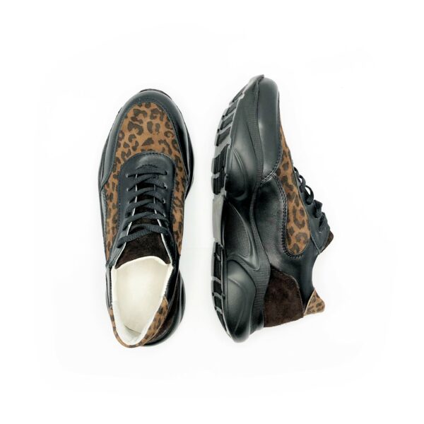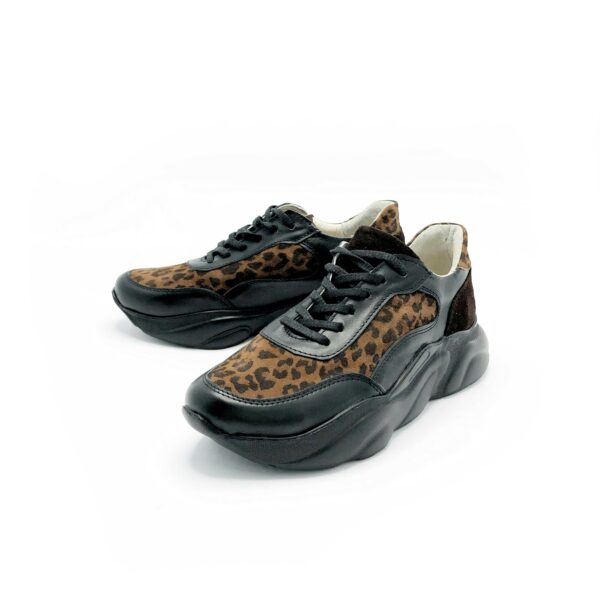 Стильные молодежные кроссовки из натуральной кожи черного цвета со вставками леопарда на облегченной подошве. Изготавливаются только из натуральных материалов. Полномерные соответствуют стандартной сетке размера. Возможен отшив в коже и замши разных цветов – учитываем любые пожелания заказчика