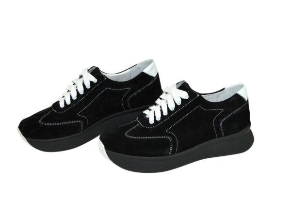 Мягкие комфортные кроссовки изготовлены из натуральной замши черного цвета со вставкой из белой кожи. С мягким кантом и мягким языком. Прекрасно сидят на ножке. Полномерные, соответствуют стандартной сетке размера. Рассчитаны на разную полноту ноги благодаря шнуровке. Возможен отшив в коже, замши разных цветов.