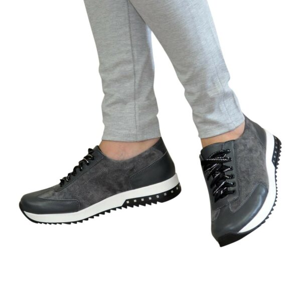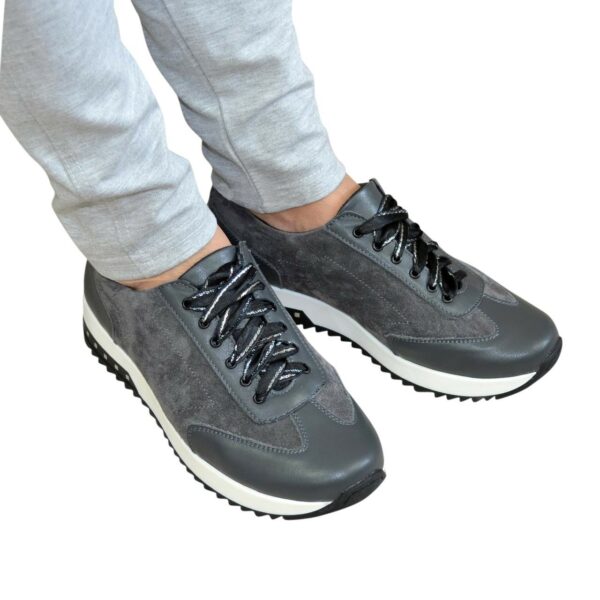 Мягкие комфортные кроссовки изготовлены из натуральной кожи и замши серого цвета. С мягким кантом и мягким языком. Прекрасно сидят на ножке. Полномерные, соответствуют стандартной сетке размера. Рассчитаны на разную полноту ноги благодаря шнуровке. Возможен отшив в коже, замши разных цветов.