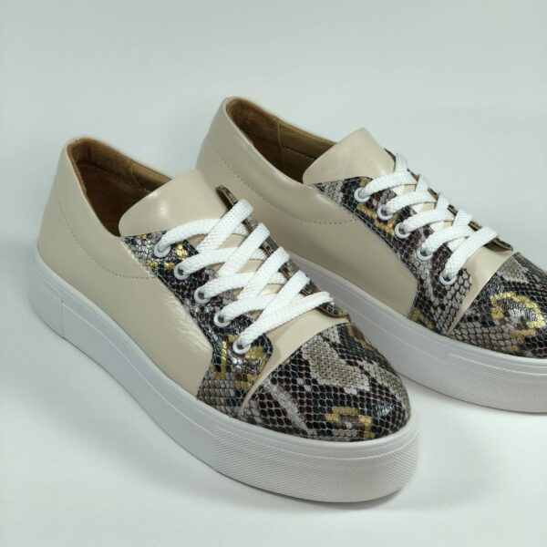 Облегченные кеды аккуратно смотрятся на ножке! Изготовлен из натуральной кожи бежевого цвета и рептилии. Соответствуют стандартной размерной сетке. Рассчитаны на разную полноту ноги благодаря шнуровке. Возможен отшив в коже, замши разных цветов.