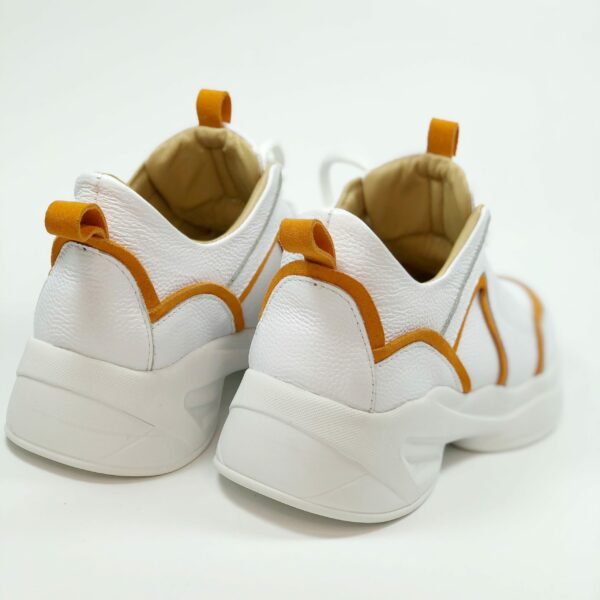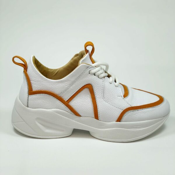 Стильные молодежные кроссовки из натуральной кожи белого цвета, декорированные оранжевым замшем, на облегченной подошве. Изготавливаются только из натуральных материалов. Полномерные соответствуют стандартной сетке размера. Возможен отшив в коже и замши разных цветов – учитываем любые пожелания заказчика