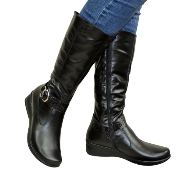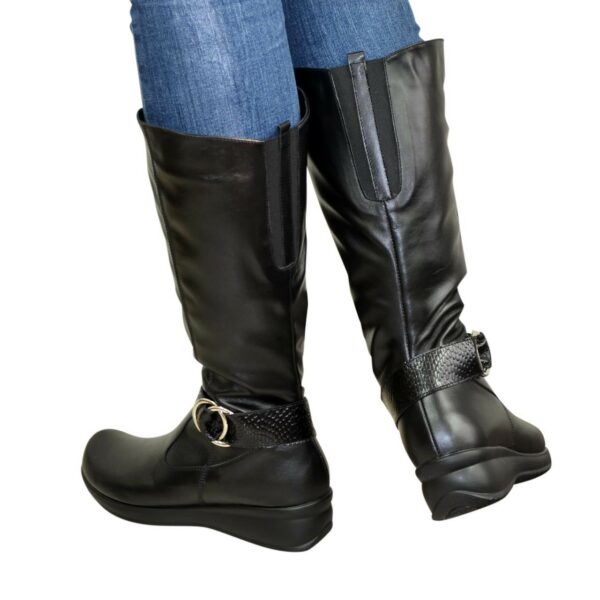Удобные и практичные женские сапоги из натуральной кожи черного цвета на танкетке. Декорированный ремешком. Объем голени можно заказать для любого размера.