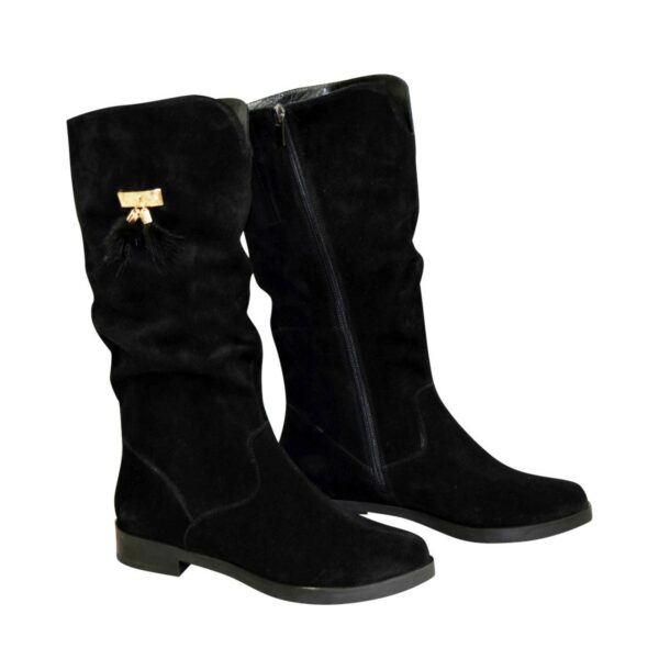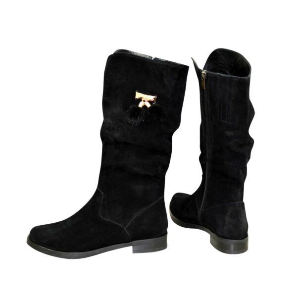 Женские сапоги изготовлены из натуральной черной замши на низком ходу. Украшенные фурнитурой. Очень удобные, идеально сидящие на ножке.
