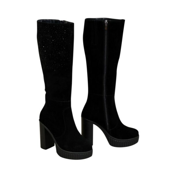 Классические женские сапоги из натуральной замши черного цвета, декорированные накаткой камней, на голенище имеется широкая вшитая резинка сбоку сапога для дополнительного объема голени, красивые удобные и стильные на высоком стойком подборе. Украшенные фурнитурой. Объем голени можно заказать для любого размера.