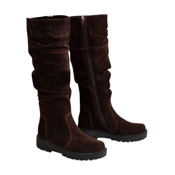 Стильные женские сапоги из натуральной замши коричневого цвета с резинкой верхней части сапога на утолщенной подошве.
