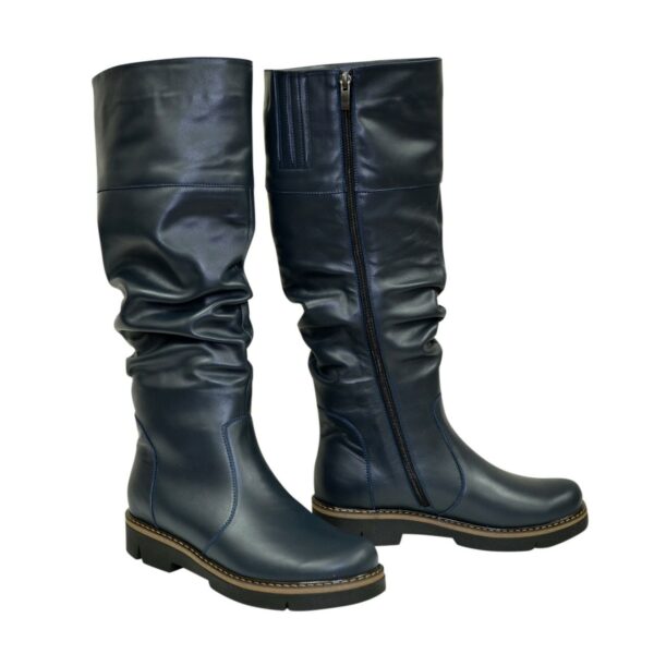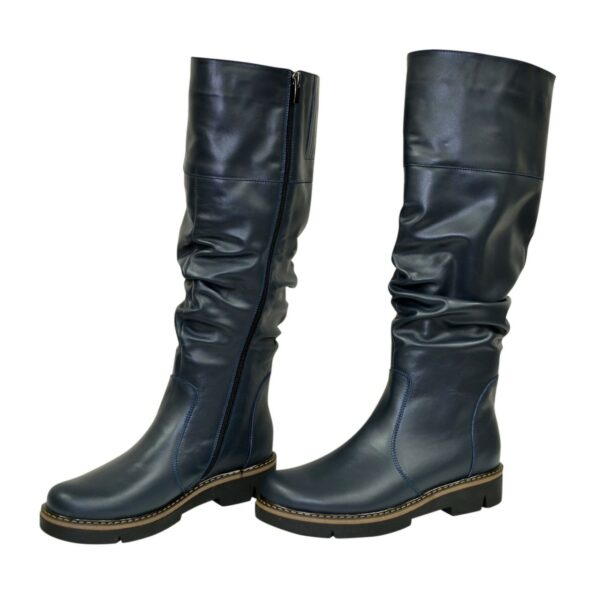 Стильные женские сапоги из натуральной кожи синего цвета с резинкой верхней части сапога на утолщенной подошве.