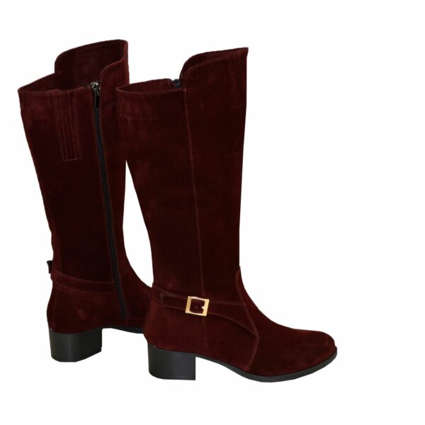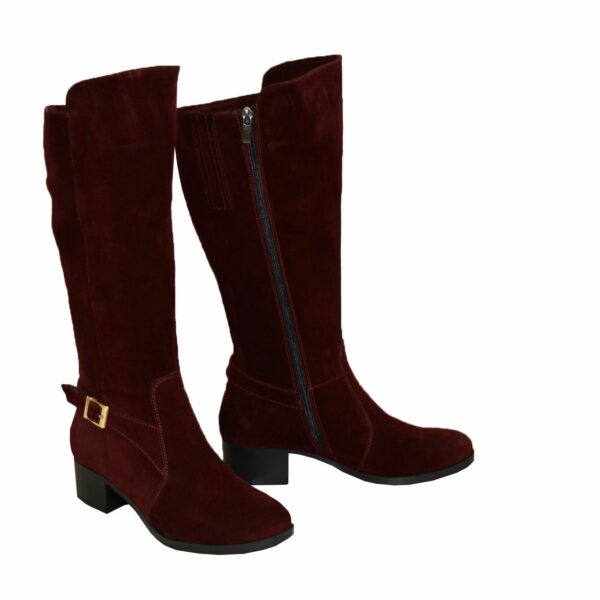 Женские сапоги из натуральной замши бордового цвета декорированы ремешком на невысоком стойком каблуке. Объем голени можно заказать для любого размера.