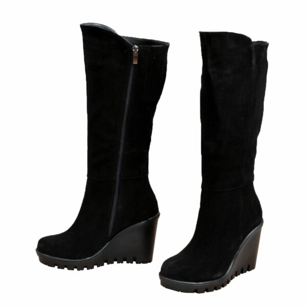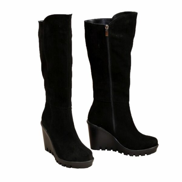 Классические женские сапоги из натуральной замши черного цвета, на голенище имеется широкая вшитая резинка сбоку сапога для дополнительного объема голени, удобные, практичные и стильные, на стойкой платформе. Объем голени можно заказать для любого размера.