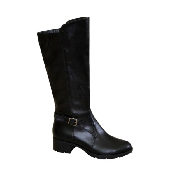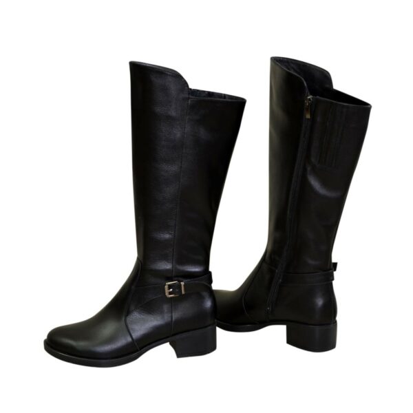 Классические женские сапоги из натуральной кожи черного цвета, декорированные ремешком, на невысоком каблуке. Объем голени можно заказать для любого размера.