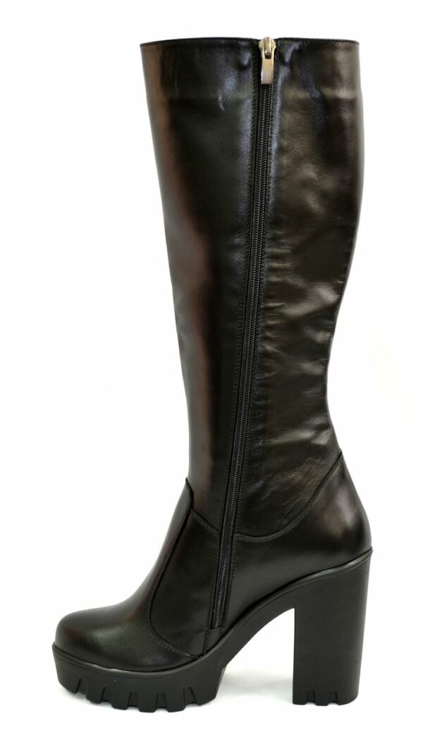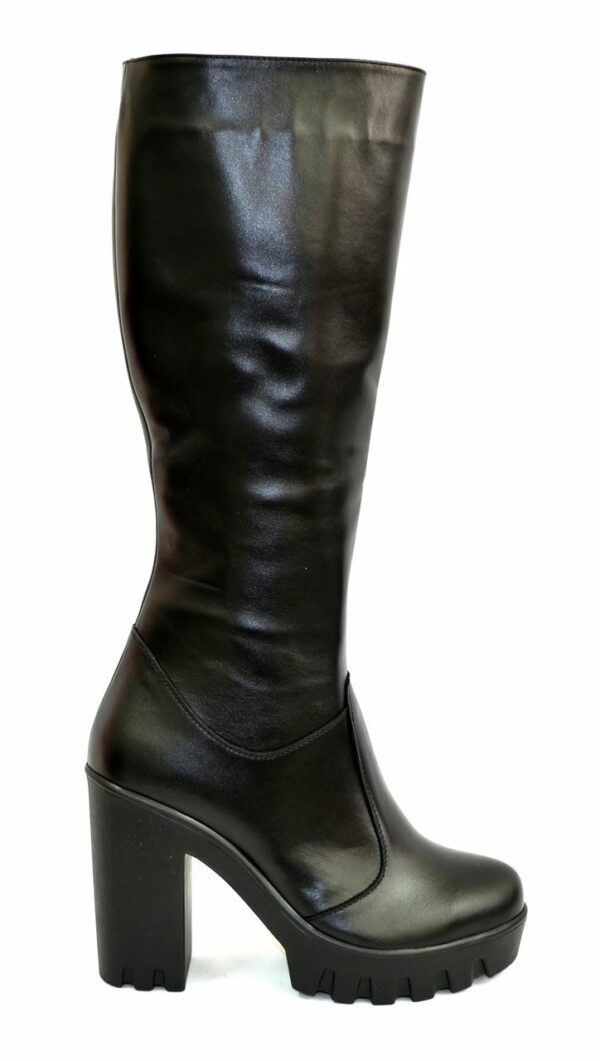 Классические женские сапоги из натуральной кожи черного цвета, красивые и стильные, на высоком стойком каблуке. Объем голени можно заказать для любого размера.