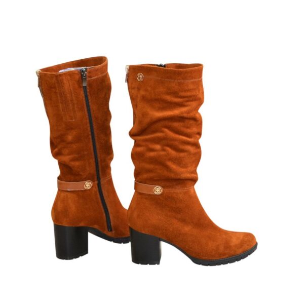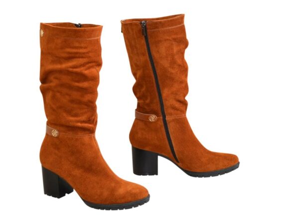Стильные женские сапоги из натуральной замши коричневого цвета с резинкой в верхней части сапога. На утолщенной подошве со стойким каблуком. Объем голени можно заказать от 35 см до 40 см для любого размера.