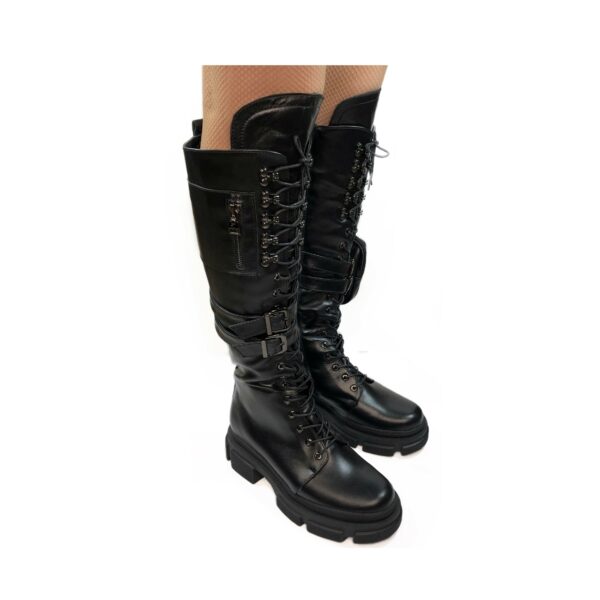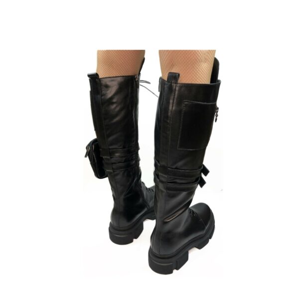 Стильные женские сапоги со шнуровкой и молнией, на небольшом каблуке, изготовлены из натуральной кожи черного цвета. Со съемным карманом. Очень удобные, идеально сидящие на ножке.
