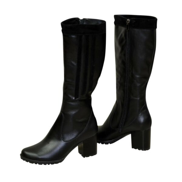 Женские сапоги из натуральной кожи черного цвета, декорированные вставками из натуральной замши, на стойком подборе, на голенище имеется широкая вшитая резинка сбоку сапога для дополнительного объема голени. Удобная, высокая модная модель. Объем голени можно заказать для любого размера.